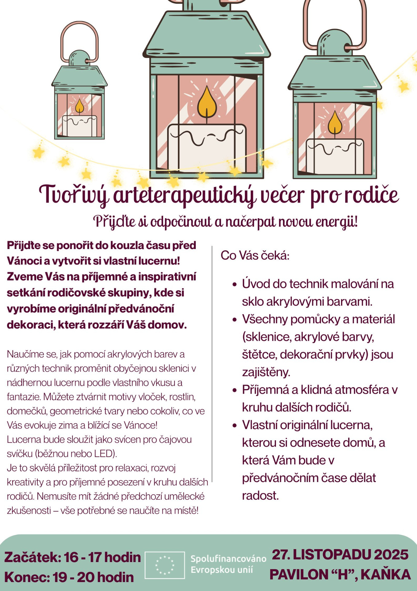 srdečně Vás zveme na dva tvořivé večery rodičovské skupiny dětí z Centra Kaňka. Aktivitu spolufinancuje jako podporu pečujících Evropská unie v rámci projektu "Rozvoj neformální péče o klienty Centra Kaňka".